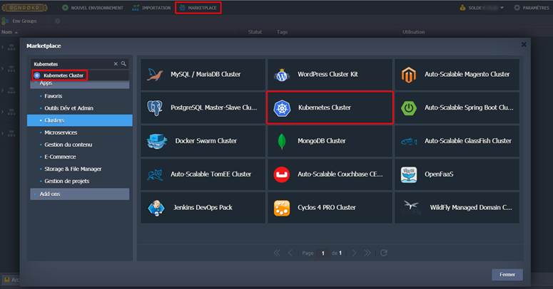 La solution Kubernetes Cluster est disponible pour une installation automatique via RAGNARØKKR Marketplace dans la catégorie Clusters (ou utilisez la fonction de recherche pour la localiser).