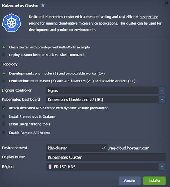 - Attach dedicated NFS Storage with dynamic volume provisioning : décochez si vous voulez enregistrer votre propre classe de stockage (nécessite une connaissance approfondie du K8s)