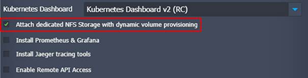 Actuellement, la seule option automatisée pour le stockage backend est le provisionneur de volume basé sur le stockage NFS. Il peut être sélectionné via l'assistant d'installation du package. Nous recommandons de s'en tenir à cette option lorsque l'on travaille avec le Cluster Kubernetes.