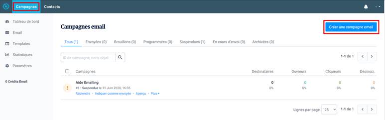 Dans la section Campagnes, cliquez sur Créer une campagne email.