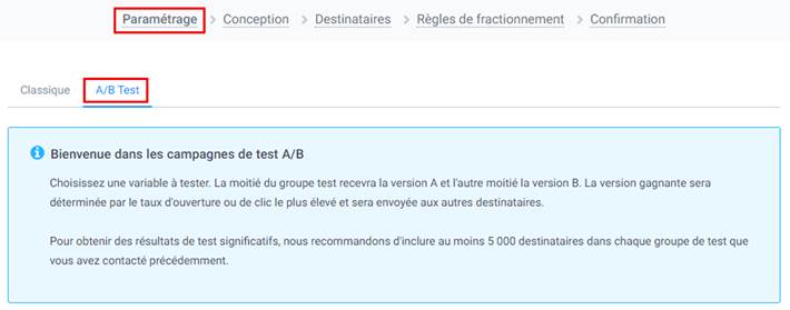 Dans la page de Paramétrage, sélectionnez l’option A/B Test.