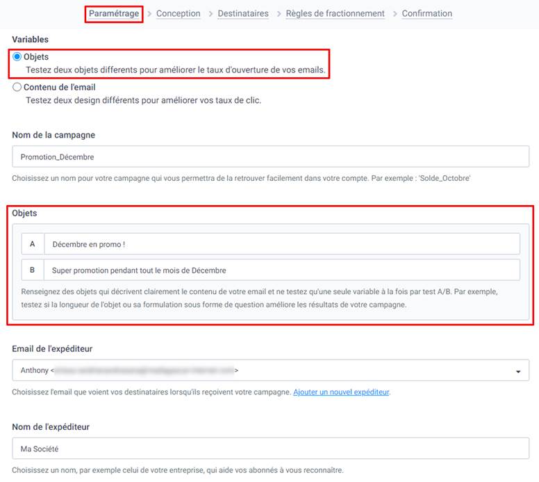 Saisissez le nom de votre campagne puis renseignez les champs A et B avec les 2 versions de l’objet à tester, qui reflètent bien le contenu de votre email. Dans l’exemple de l’image ci-dessous, notre test se focalisera sur la longueur de l’objet de l’email.