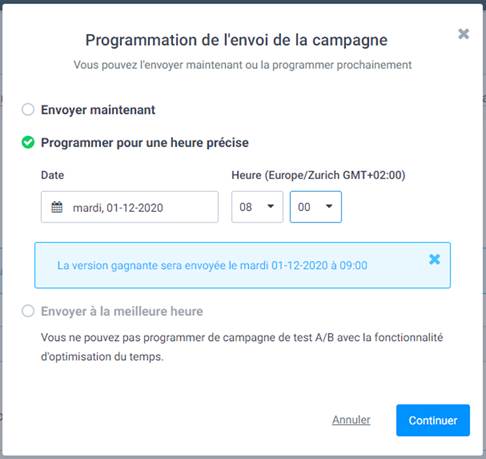 Pour une campagne email de test A/B, vous n’aurez que 2 choix pour la programmation de l’envoi :