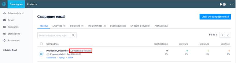 Vos campagnes email de test A/B seront facilement reconnaissables grâce à la balise A/B Test visible à côté du nom de vos campagnes.
