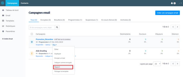 Il est toujours possible de modifier ou de suspendre votre campagne email de test A/B tant qu’elle n’est pas encore envoyée aux destinataires.