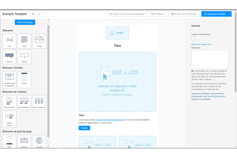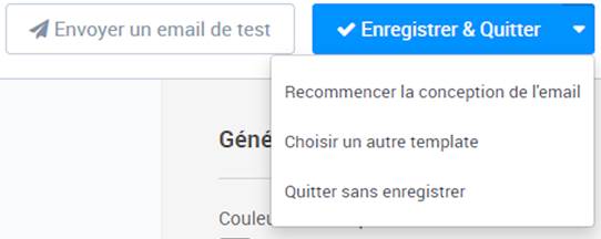 - En haut à droite, vous avez les boutons Envoyer un email de test (qui vous permet d’effectuer un Bon A Tirer ou BAT) et Enregistrer & Quitter (si vous développez ce dernier, vous aurez les options Recommencer la conception de l’email, Choisir un autre template et Quitter sans enregistrer)