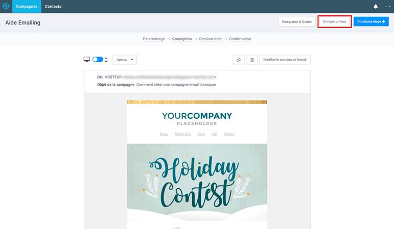 Quand la création du design de votre email est terminée et enregistrée, vous trouverez dans la page de l’étape de conception le bouton Envoyer un test.