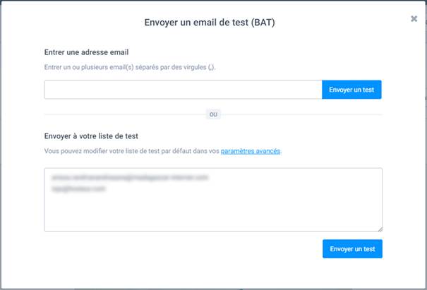 En cliquant sur ce bouton, vous pourrez envoyer un BAT (c’est-à-dire un email de test) à un ou plusieurs destinataires en entrant le ou les adresses emails dans le champ prévu à cet effet, ou l’envoyer à votre liste de test.