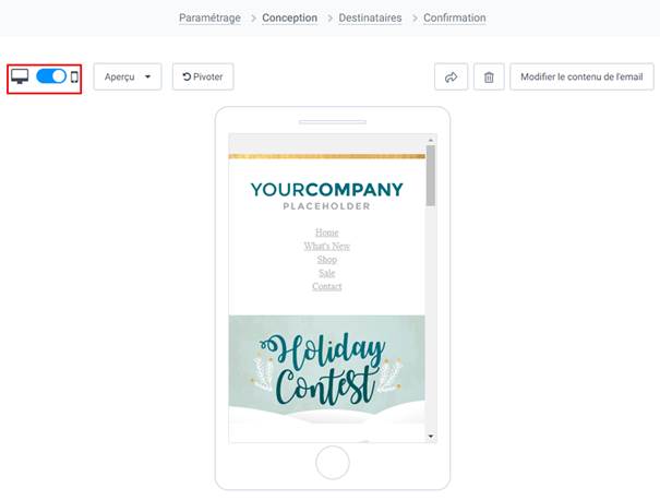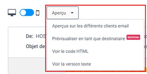 Par défaut, vous avez déjà l’aperçu de votre email sur écran de bureau, mais vous pouvez aussi voir son affichage sur tablette et smartphone en cliquant sur le commutateur indiqué sur l’image ci-dessous :
