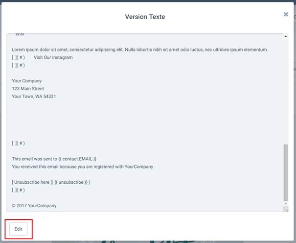 Concernant la version texte de vos emails, elle est générée de façon automatique. Vous pouvez modifier cette version texte en cliquant sur Edit dans la fenêtre de la version texte. Vos modifications n’affecteront pas la version HTML de l’email.
