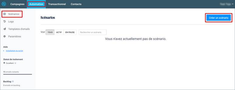 1. Connectez-vous d’abord à votre compte emailing et allez dans Automation > Scénarios, puis cliquez sur Créer un scénario.