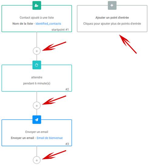 Vous pouvez ajouter d’autres points d’entrée et d’autres étapes (actions ou conditions) dans votre scénario en cliquant sur les « + » pointés par les flèches sur l’image ci-dessous.