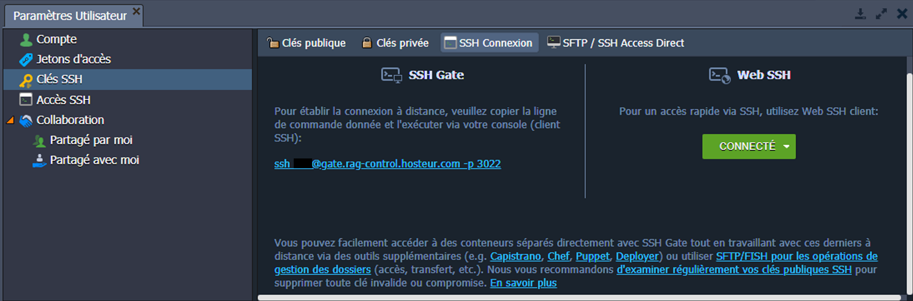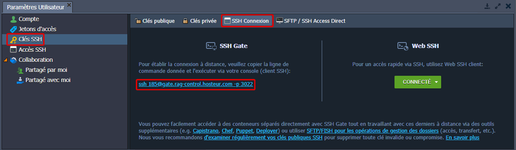 Dans la fenêtre des Paramètres utilisateur ouvert, allez à l'onglet Clés SSH > SSH Connexion. Vous y trouverez les informations nécessaires pour accéder à un compte, y compris une chaîne de connexion SSH (encadrée dans l'image ci-dessous).