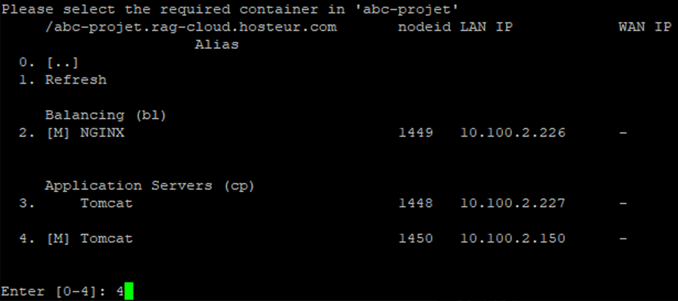 De plus, chaque conteneur est fourni avec des données d’ID noeud, d'IP LAN, d'IP WAN et d'Alias. Pour accéder au nœud requis, il suffit d'entrer son numéro.
