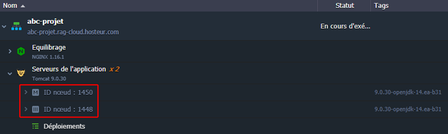 2. Après avoir sélectionné un environnement, vous verrez une liste complète de ses conteneurs, qui sont regroupés par couches. Ici, le nœud maître (nécessaire pour le regroupement, l’ajustement, le clonage, etc.) est désigné par la marque [M].