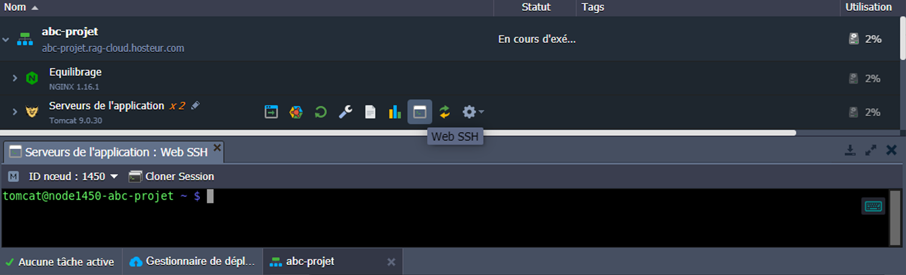 Il suffit de cliquer sur le bouton Web SSH à côté de la couche requise ou d'un nœud particulier pour que l'onglet avec émulateur de terminal s'ouvre :