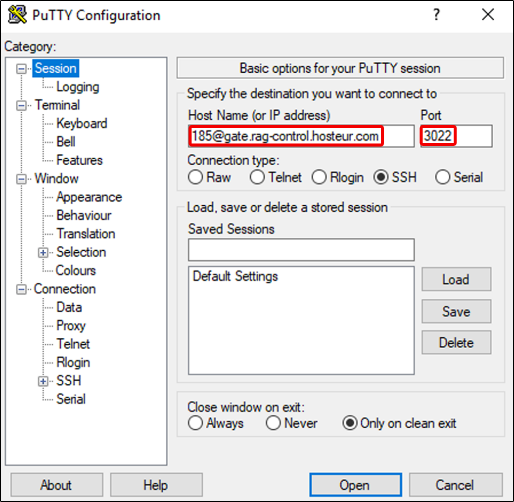 Naviguez jusqu'à l'onglet Session dans la liste de gauche et remplissez les champs Host Name (ou adresse IP) et Port en fonction de votre chaîne de connexion SSH.