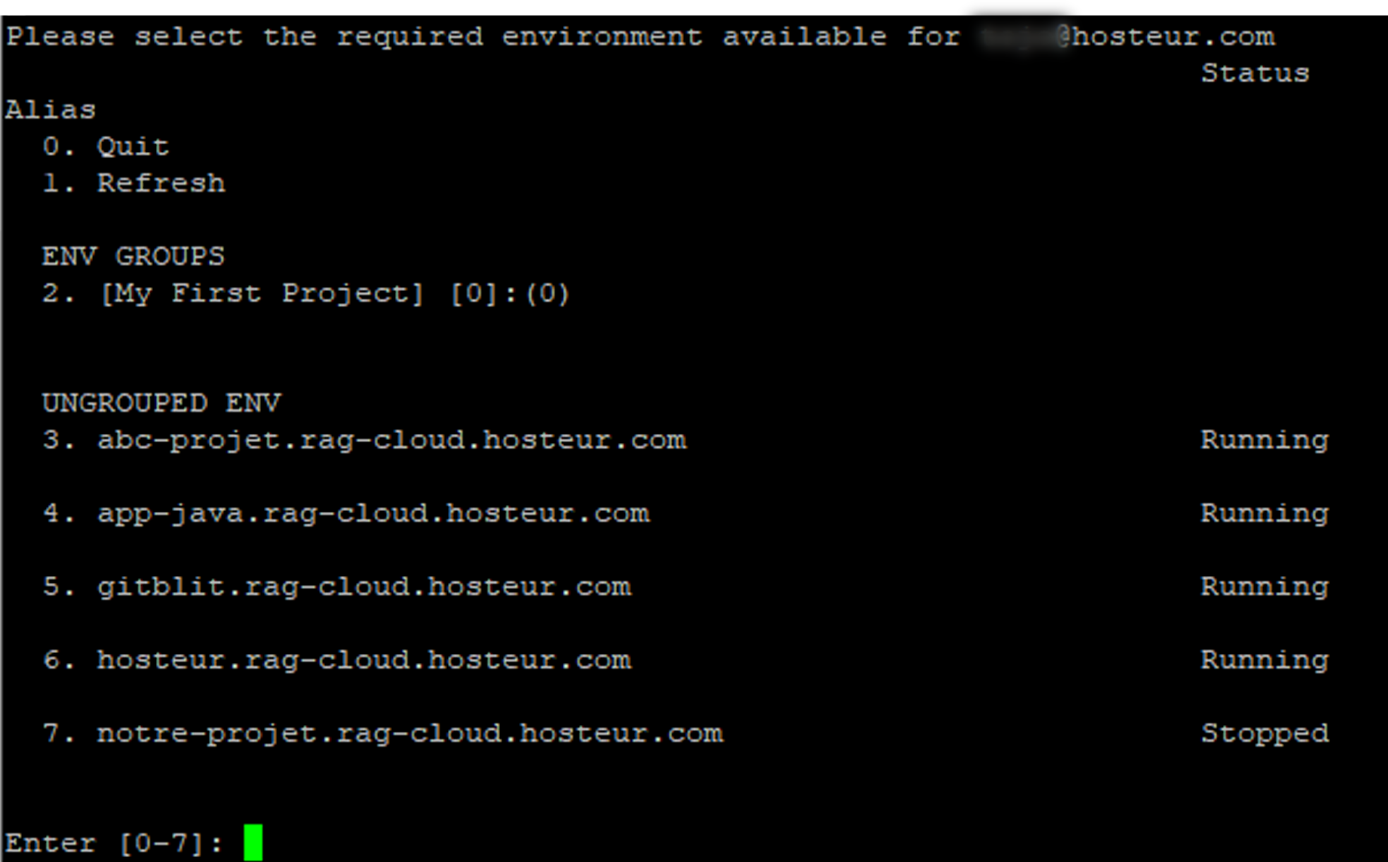 1. Une fois connecté, vous verrez une liste des groupes d'environnement (avec un certain nombre de conteneurs entre parenthèses) et des environnements non groupés disponibles pour votre compte. Sélectionnez le point requis en entrant le numéro approprié.