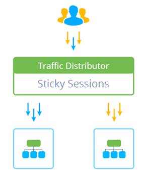 De cette manière, la distribution par Sessions Permanentes d'un nouvel utilisateur est similaire à la méthode Round Robin et est effectuée selon la priorité préétablie. Par exemple, en fixant une priorité de 50% à 50%, les deux versions de l'application seront visitées par le même nombre d'utilisateurs uniques, ce qui est utile pour effectuer des tests A/B. Mais, quel que soit le poids du serveur, les demandes de l'ancien utilisateur seront toujours redirigées vers les hôtes auxquels elles sont affectées, jusqu'à ce que leur session soit expirée ou que le cookie soit supprimé.