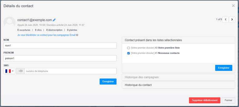 Pour afficher les détails d’un contact, cliquez sur l’adresse email de ce dernier. La fenêtre des détails s’ouvrira dans laquelle figureront les diverses informations concernant le contact.