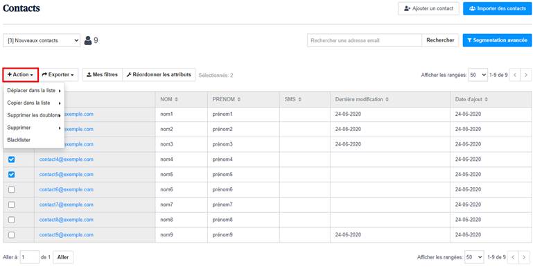Vous devez d’abord cochez le ou les contacts souhaités pour voir apparaître le bouton Action, puis cliquez dessus pour afficher les différentes actions que vous pourrez faire sur vos contacts :