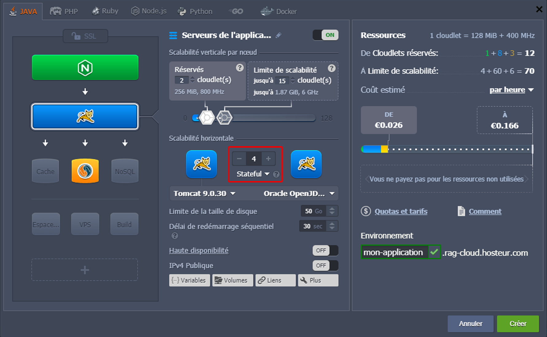 Sur la base de ces particularités, RAGNARØKKR PaaS recommande (et applique par défaut) le mode d'ajustement stateful pour l'équilibreur de charge, le serveur d'application et les piles de VPS. En cas de nécessité, vous pouvez redéfinir manuellement le mode d'ajustement de vos nœuds à tout moment via l'assistant de topologie.