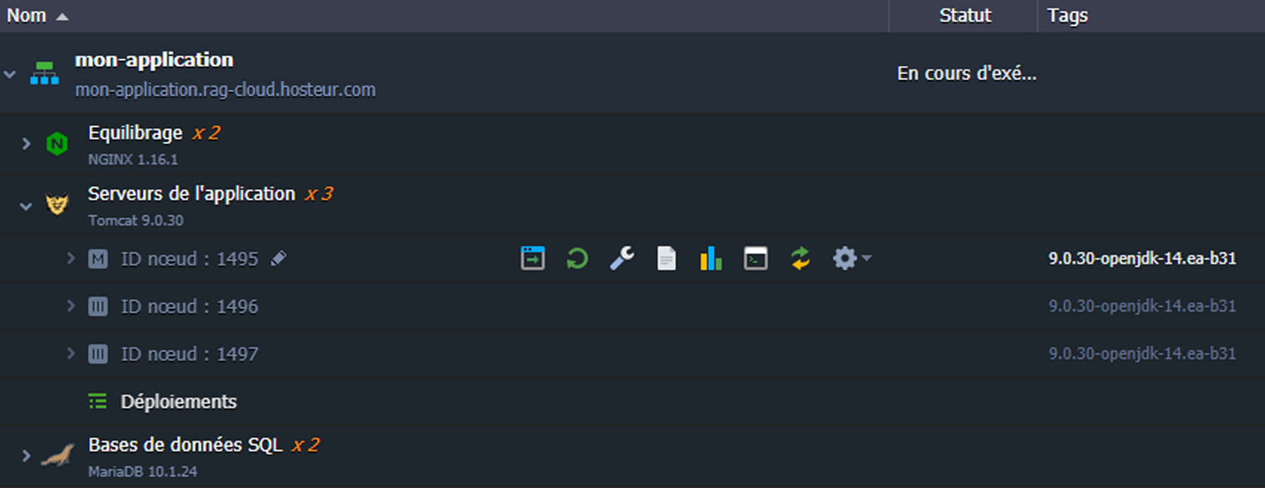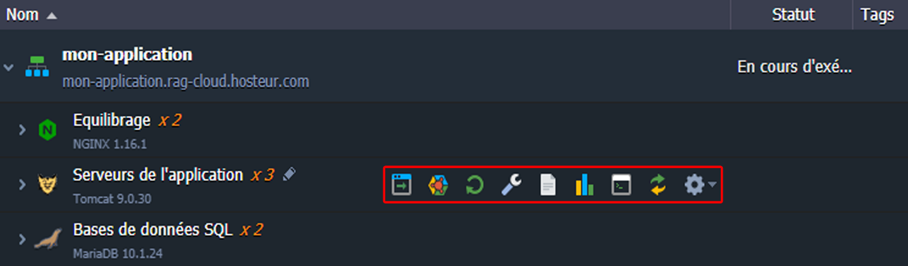 Le fait d'avoir plusieurs nœuds de même type dans une couche permet leur gestion synchrone. Ainsi, tous les conteneurs compris peuvent être simultanément configurés, inspectés pour les journaux et les statistiques, redémarrés ou redéployés grâce aux icônes correspondantes.