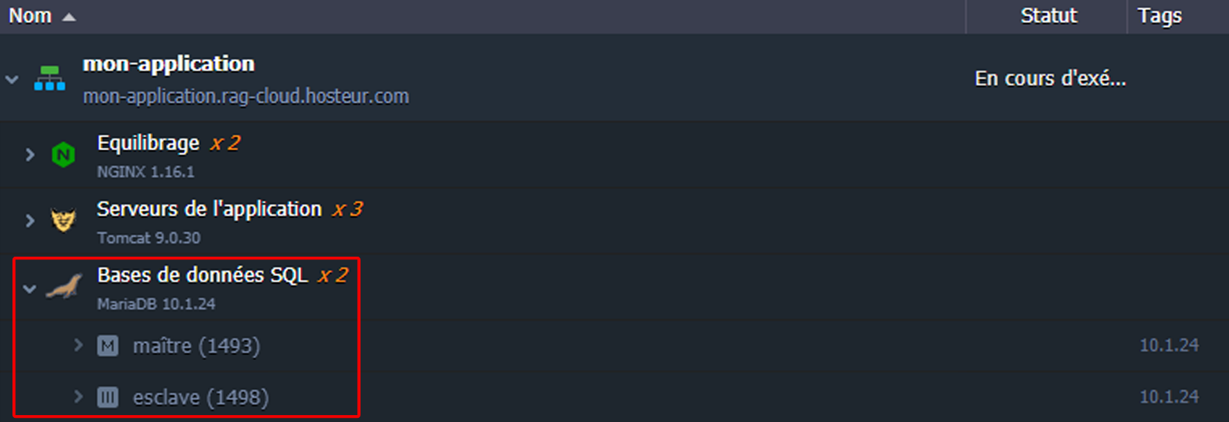 Chaque groupe de nœuds d'environnement (couche) est doté d'un nom spécifique qui, si nécessaire, peut être ajusté manuellement. Au cas où il y aurait plusieurs instances à l'intérieur, le nom de la couche sera complété par l'étiquette xN (où N est le nombre réel de nœuds).