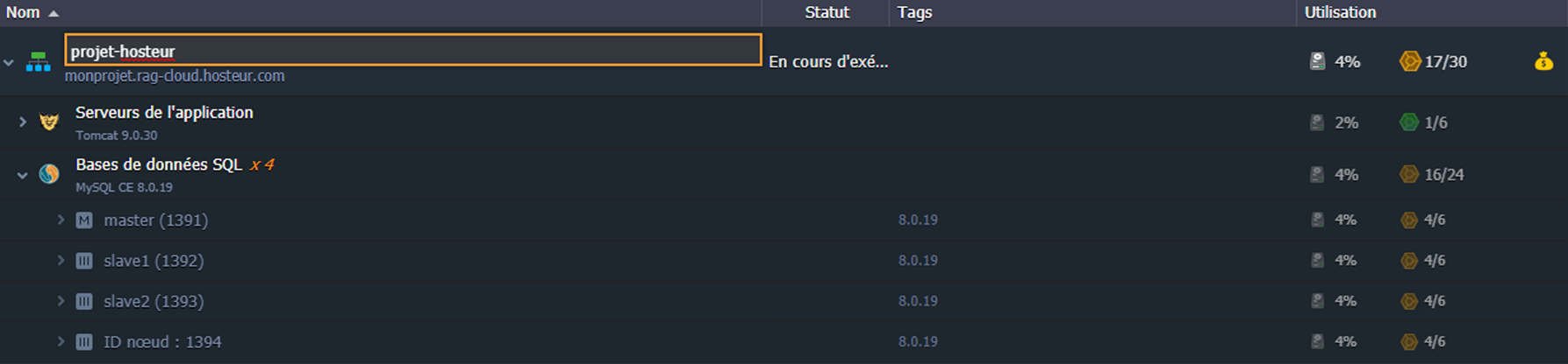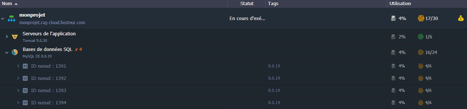 1. Sélectionnez l'environnement nécessaire avec un ensemble de nœuds de même type et développez la liste des instances :