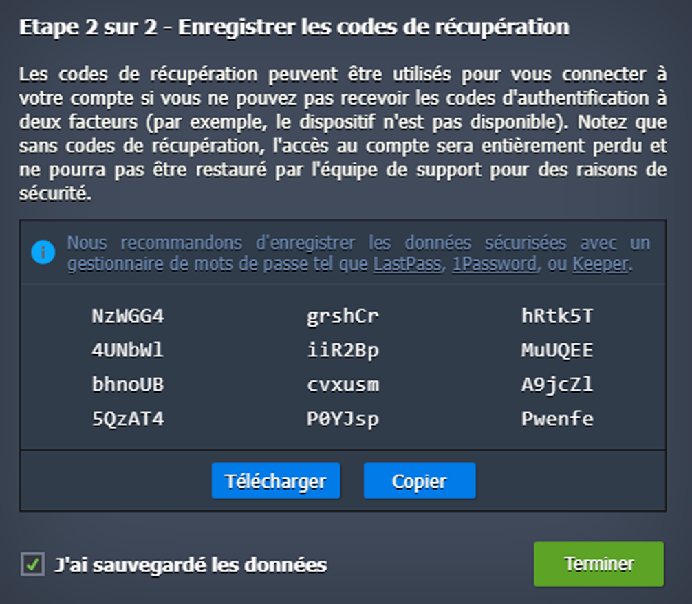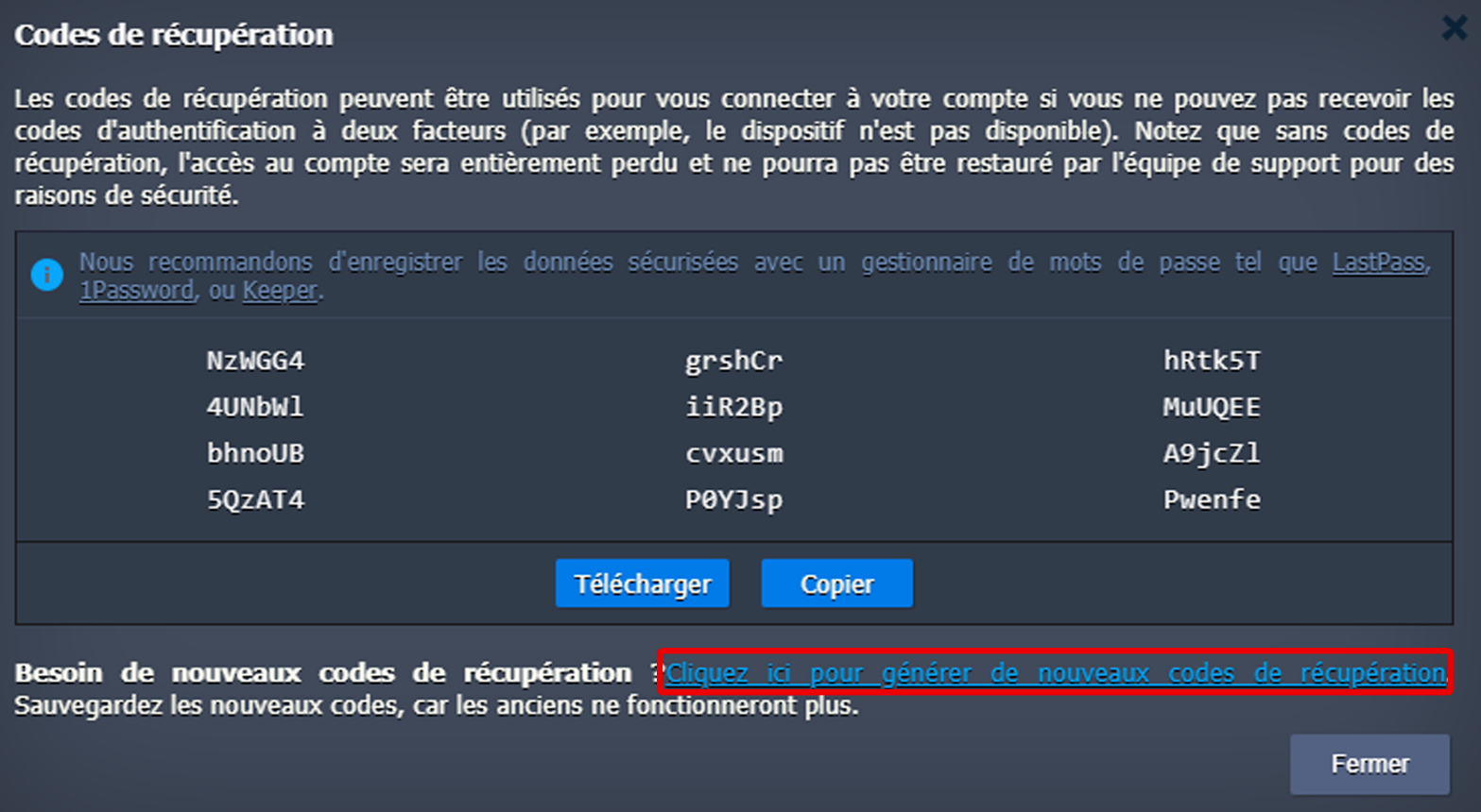 N'oubliez pas de sauvegarder les codes de récupération affichés avec les boutons télécharger/copier, car les anciens ne fonctionneront plus.