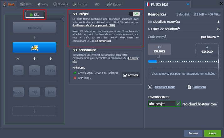 Remarque : le SSL intégré n'est pas compatible avec l'adresse IP publique attachée à vos serveurs et s'applique uniquement au domaine du nom d'environnement spécifié (par exemple, abc-projet.rag-cloud.hosteur.com pour l'image ci-dessus).