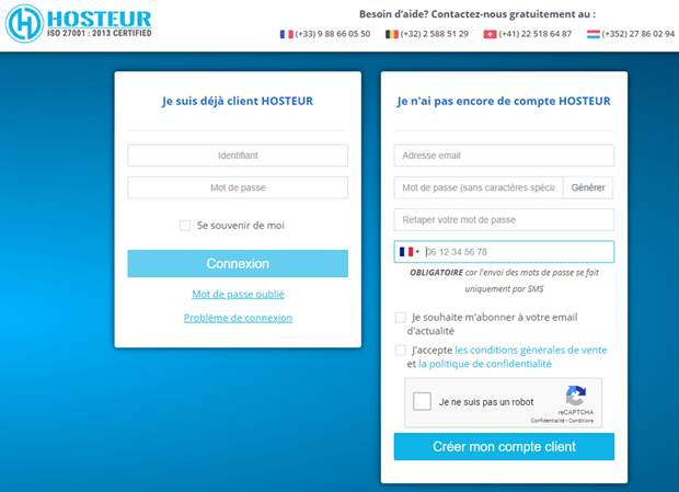 3. Vous serez redirigés vers la page de connexion au compte HOSTEUR. Entrez vos identifiants (ID Client et mot de passe) et connectez-vous ou créez un compte si vous ne faites pas encore partie de nos clients.