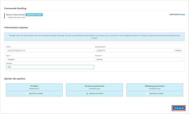 4. Une fois que vous êtes connectés à votre compte HOSTEUR, remplissez les champs requis pour la création de votre compte HOSTEUR Emailing.