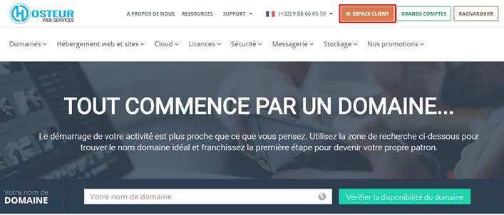 En naviguant sur notre site web (https://www.hosteur.com/), vous trouverez le bouton « Espace client » en haut de la page.