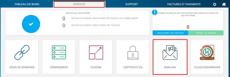 Dans l’onglet SERVICES, cliquez sur EMAILING.