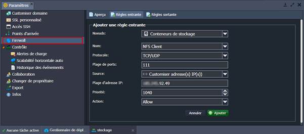 5. Ensuite, vous devez ouvrir les ports du serveur NFS (111 et 2049) pour l'adresse IP du client NFS (celle utilisée lors de la deuxième étape). Accédez à la section Paramètres de l'environnement de stockage > Firewall pour ajouter les règles requises via l'interface utilisateur intuitive :