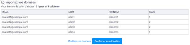 Dans le cas de notre exemple, une fois nos contacts importés, nous pouvons voir dans la page des Contacts que les chiffres 1 et 2 (appelés ici ID des éléments) dans le champ PAYS ont été remplacés par leurs valeurs respectives (1 pour France et 2 pour Suisse) que nous venons de configurer.