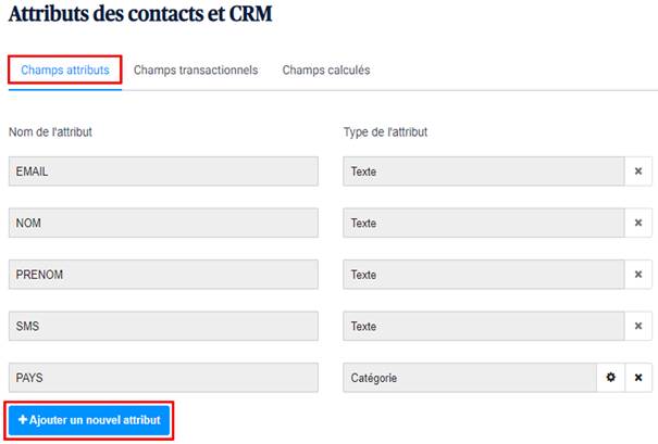 Dans la page des Attributs des contacts et CRM qui s’ouvre, sélectionnez l’onglet Champs attributs, ensuite cliquez sur Ajouter un nouvel attribut.