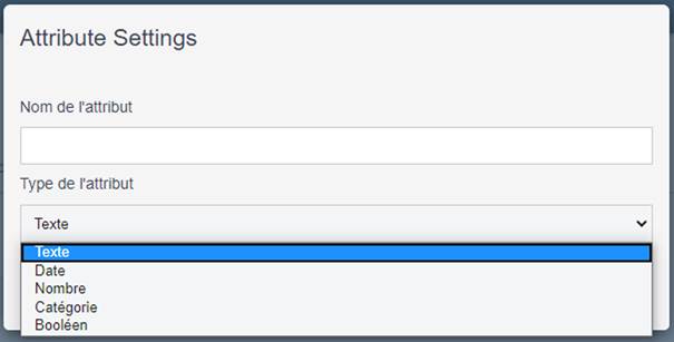Entrez le nom de l’attribut et choisissez le type de valeur parmi ceux qui sont proposés : texte, date, nombre, catégorie, booléen.