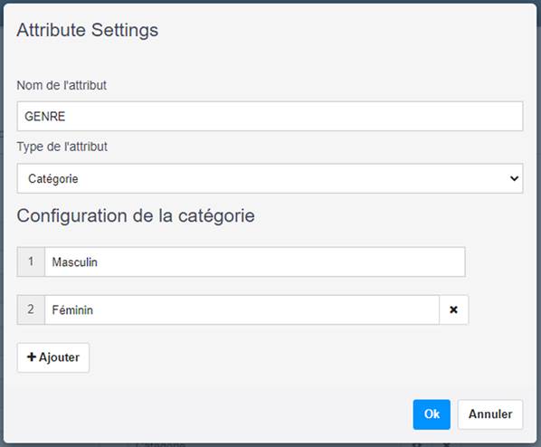 A titre d’exemple, nous avons créé l’attribut GENRE avec le type Catégorie et nous y avons ajouté les éléments suivants (en cliquant sur le bouton Ajouter) :