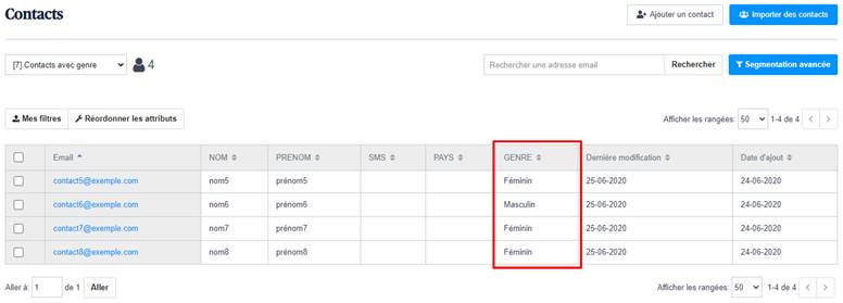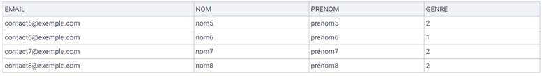 Ainsi, quand nous importerons des fichiers de contacts qui contiendront la colonne GENRE, il nous suffira juste de spécifier les ID 1 ou 2 dans cette colonne pour que les valeurs Masculin ou Féminin s’affichent dans notre liste de contacts importés.