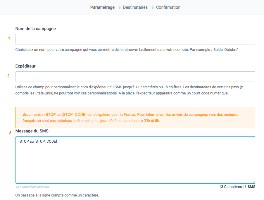 Remarque : n’envoyez pas votre campagne SMS le dimanche, les jours fériés et la nuit entre 22h et 8h, cela n’est pas autorisé.