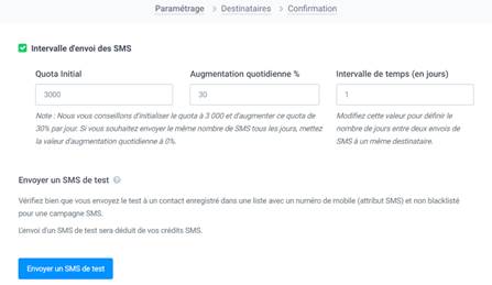 Vous pouvez également définir un intervalle d’envoi des SMS en cochant cette option et envoyer un SMS de test. Notez que ce dernier sera déduit de vos crédits SMS.