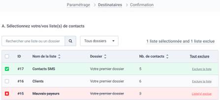 Vous pouvez exclure des listes, c’est-à-dire que les contacts dans ces listes ne recevront pas votre campagne SMS. Allez à la documentation « Liste repoussoir » pour en savoir plus.