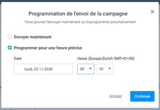 Après avoir cliqué sur le bouton Programmer, vous pourrez lancer votre campagne SMS immédiatement ou la programmer pour qu’elle soit envoyée ultérieurement, à une date et heure précises.