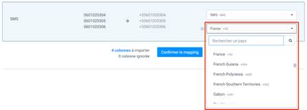 Lors de l’importation, si vous importez un fichier (.csv ou .txt) ou si vous effectuez un copier/coller, vous devrez sélectionner un seul code pays pour le champ SMS à l’étape de Mapping des champs. De ce fait, vous devez importer un fichier dont les numéros de téléphone ont le même code pays.