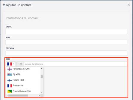 Si vous ajoutez manuellement un contact, il vous sera aussi demandé de choisir le code pays pour le champ SMS.
