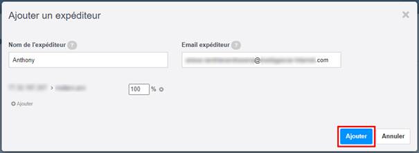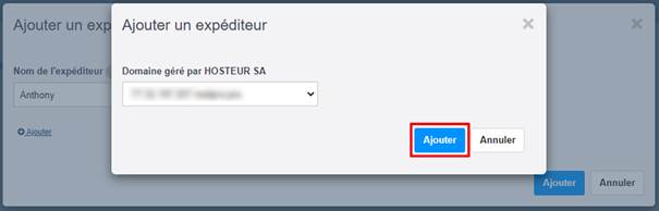 Cliquez ensuite sur le petit bouton « Ajouter » qui se trouve sous le nom de l’expéditeur et sélectionnez une IP reliée à un domaine géré par HOSTEUR dans la liste déroulante (cela peut être une IP mutualisée, ou éventuellement une IP dédiée).
