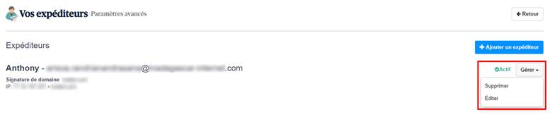 Vous pourrez toujours supprimer ou éditer vos expéditeurs en cliquant sur le bouton « Gérer ».