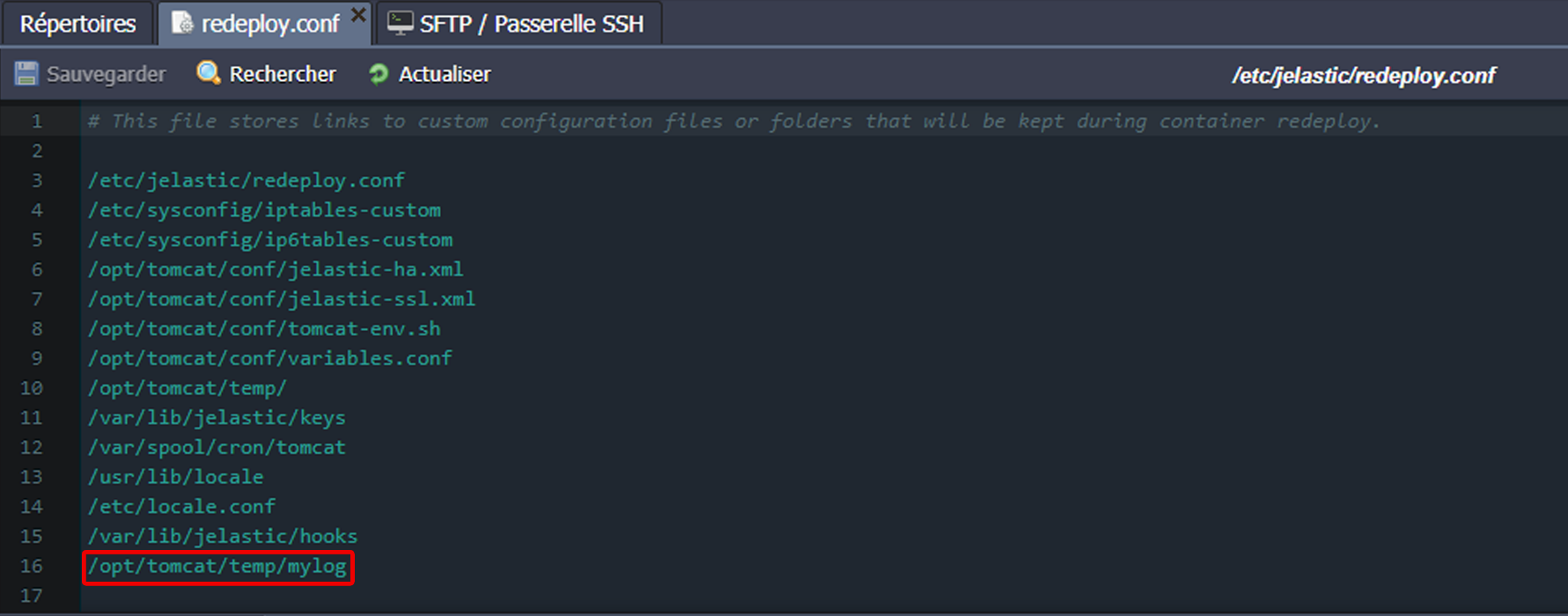 3 echo "$(pwd)/mylog" >> /etc/jelastic/redeploy.conf